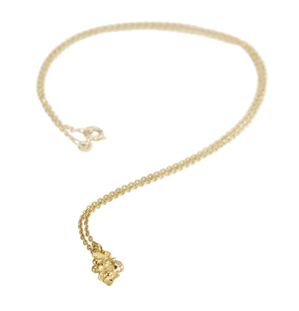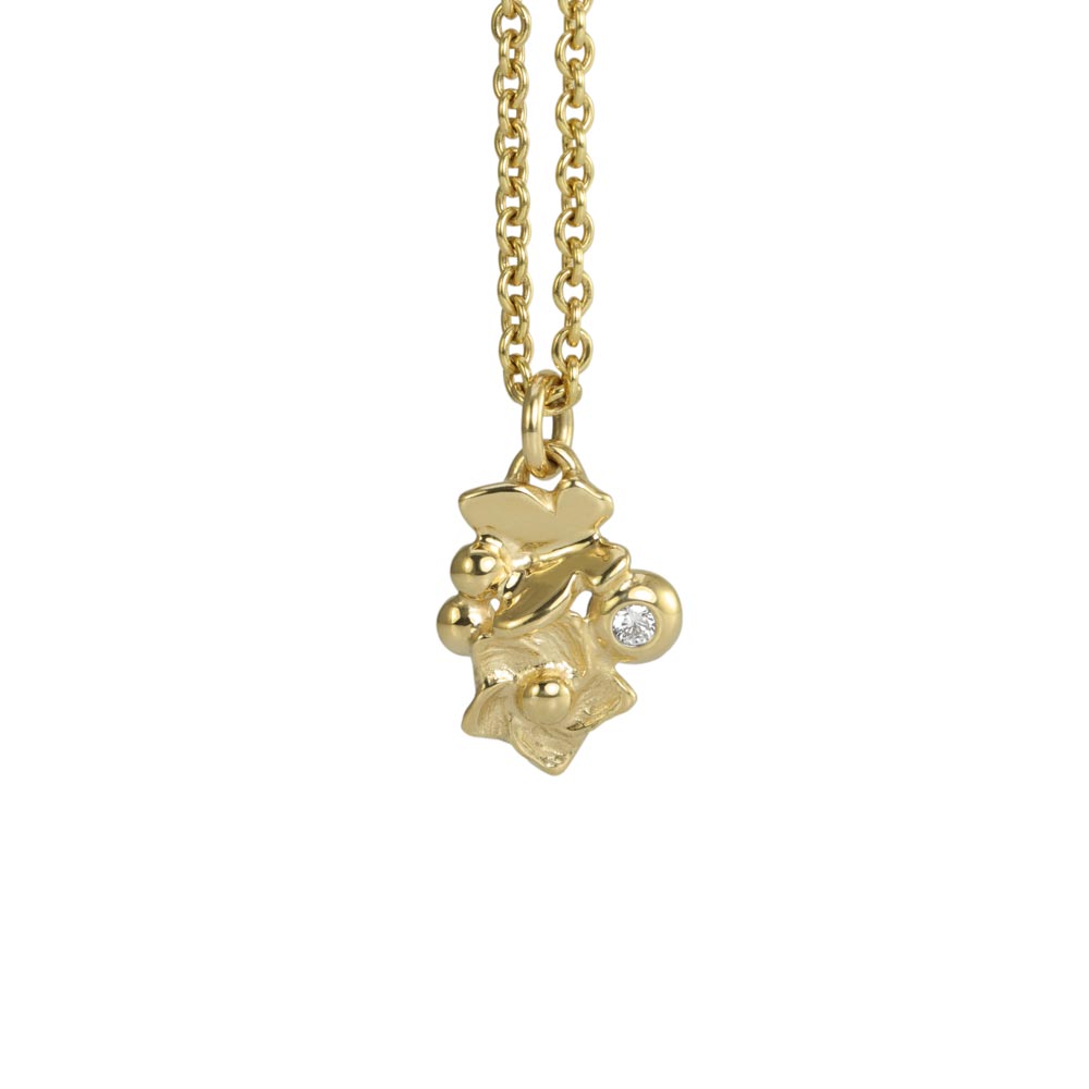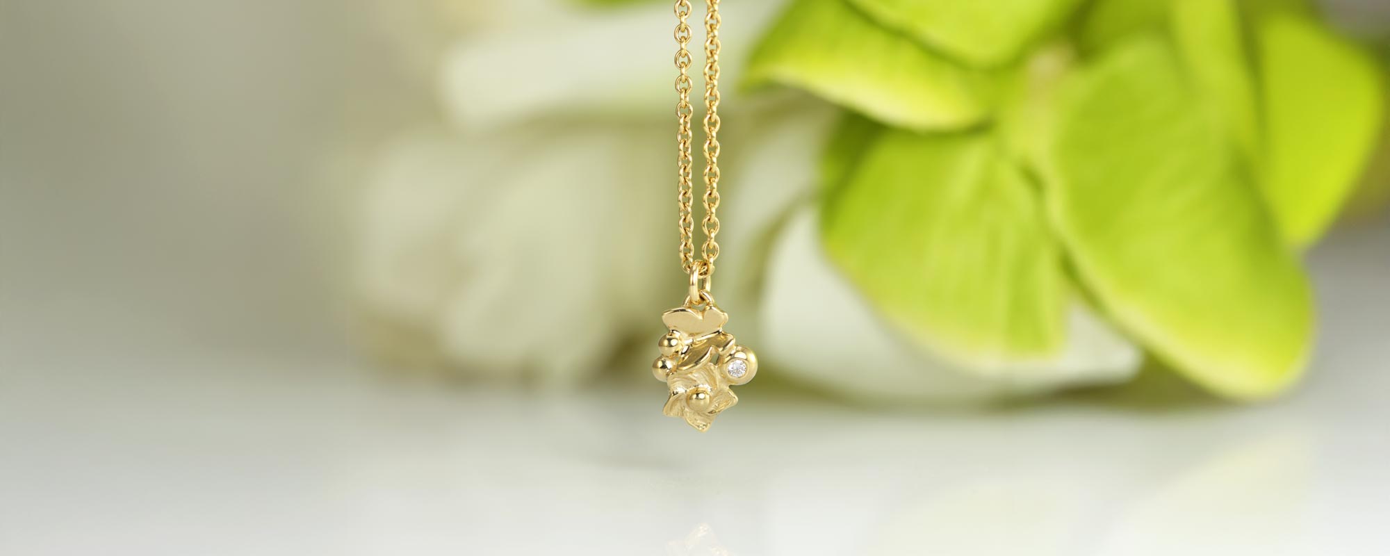 En blomst og en sommerfugl mødes i dette yndige lille vedhæng, der emmer af sommer og livsglæde. Fås også uden det lille ”ekstra” i form af en hvid diamant. Eller hvad med for eksempel en grøn diamant? Skriv til os på design@castens.com , hvis du har et særligt ønske!