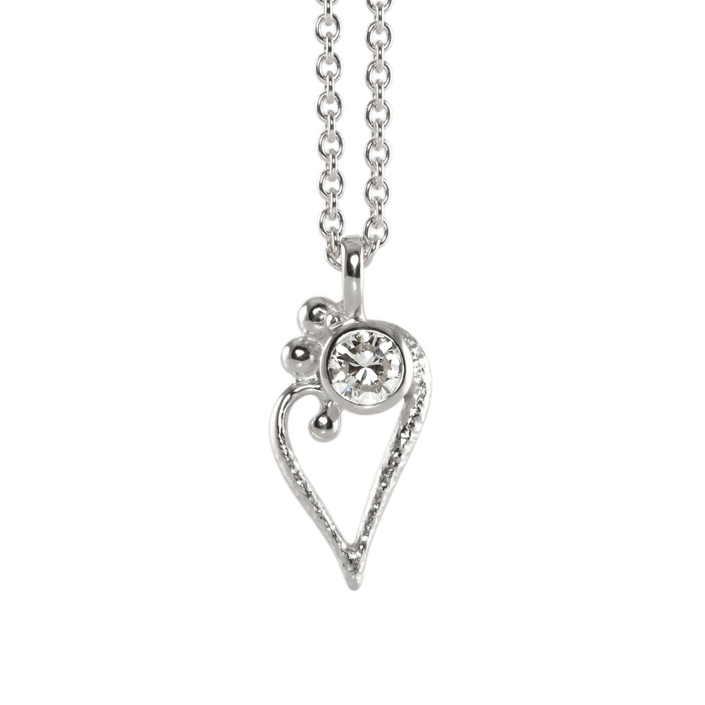 Ikke-så-klassisk hjertevedhæng formet af en delikat snirklet guld-linje. Små bobler samles rundt om fatningen med en 0,2ct diamant. Den robuste (valgfri) overflade kontrasterer de polerede detaljer og ædelstene smukt – en perfekt morgengave!
